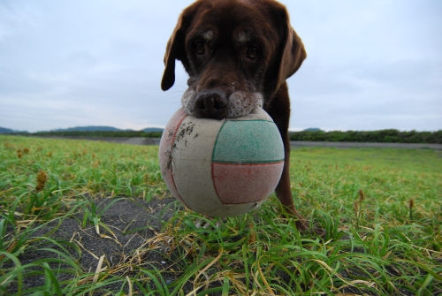 今日使ったボールはわりと多めに空気が入っていたので持っているのにかなりアゴが疲れて、あまり長くは持ち運べなかった。ただ、ウサの場合はボールを持つこともできなかったので比較で言えば、ボクんちの中では一番くわえる能力が高いことになる。
