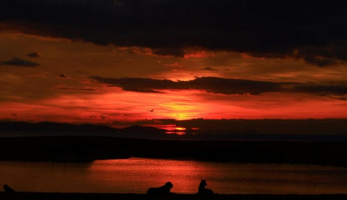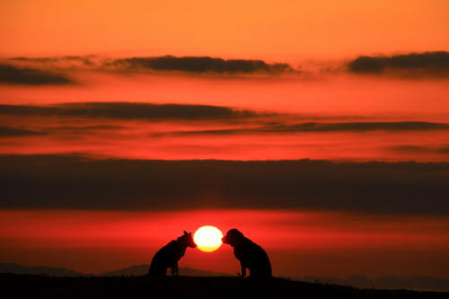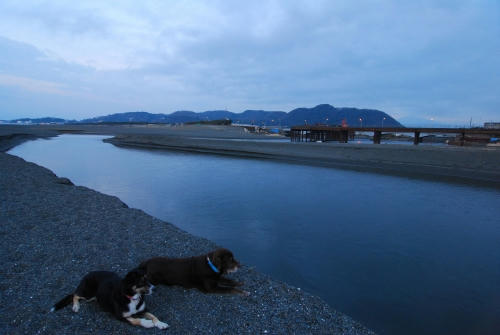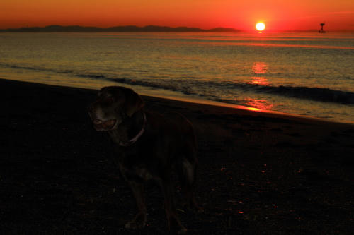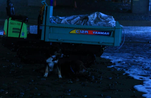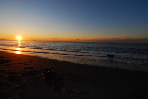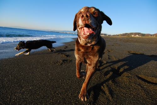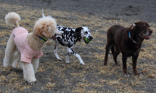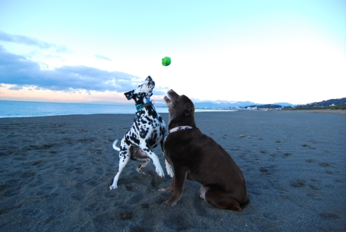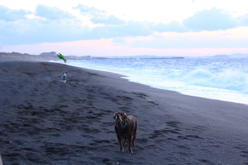 それからしばらくしてみんなで起きて居間で本格的にマッサージをしているといつの間にか海に行く時間を過ぎていた。あわてて海に行くとそこは西風の砂嵐だったので、みんなであわてなくて良かったんだねと思った。ひどい砂嵐をやり過ごすのに砂を防ぐ柵の影に身をひそめてしばらく待っていたら少しだけおとなしくなったので、砂の飛んでこない波打ち際に移動して帰り道に向かった。こんな日は誰も海になんか来ないよねと思いながら歩いて、しばらくすると砂嵐の中を切り裂いてクロエちゃんがやって来た。クロエちゃんが好きなボール遊びをするには最適な風の具合なんだってその時初めて悟ったのでボクも少しだけボール遊びをした。みんな砂まみれになったのは言うまでもない。