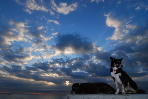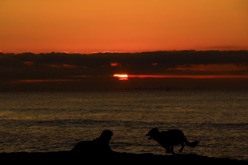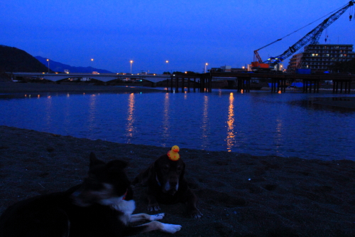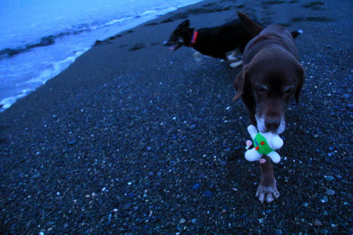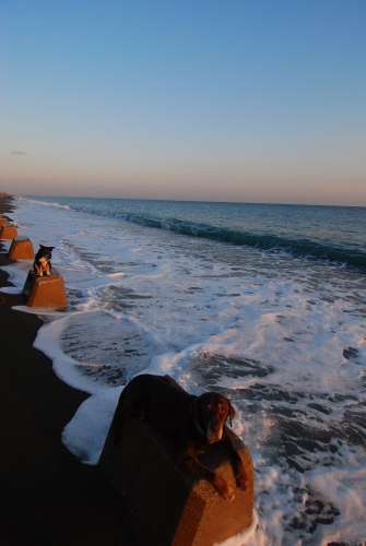 海に着いてもなかなか明るくならない。オモチャに持って来たウシさんも最初は暗くてあんまり良く見えなかった。やっと見えて来たころに少しだけ持ってお仕事をした。カラスさんも暗くてなかなか出てこなかったけど、ウシさんが見えるころにはちらほらとやって来ていた。