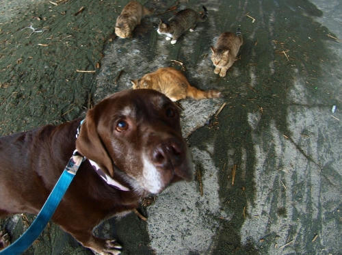 今日はウサの事をちゃんと見ていた。ウサはネコさんが近づいてくるととっととボクよりも遠い位置に離れて行った。ボクはとりあえず元の位置に座っていたけど、ネコさんの数の多さはちょっと気持ち的につらいのであまり長い時間は無理だった。で、車のとこまで離れて行ったんだけどなぜかネコさんはついてきちゃったんだ。ぱぱはそれが面白くてなかなか帰ろうとしない。面白いネコさんはいらないやって思った。