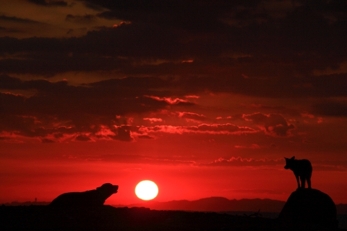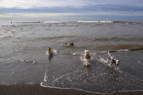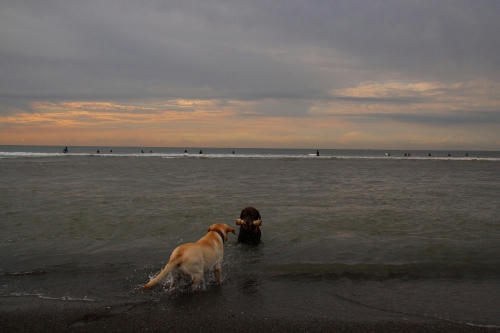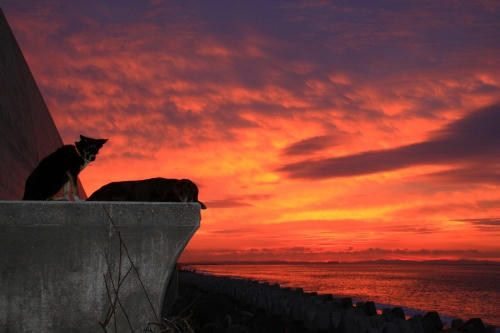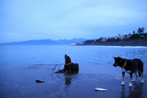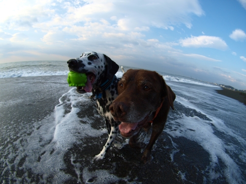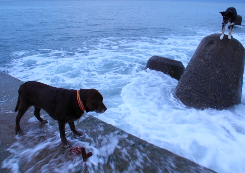 で、いつもの安全な方のブロックにボクは乗って海側の方のブロックにはウサが乗った。その位置でのお仕事はしばらくは安全だったんだけど、だんだん潮が満ちて来たのか、終わり間際に大きな波に襲われて今度はウサが水浸しになった。