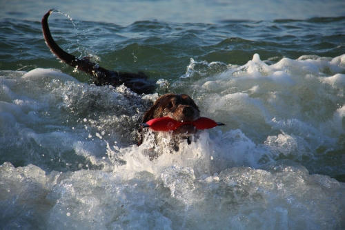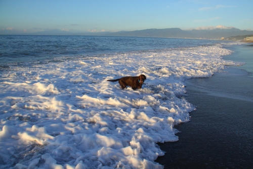 昨日できたおやつを食べながら海を歩いた。波は台風の接近の影響ほどは高くなかったので釣り人もたくさんいたけど、少しだけ遊べる余裕があったので遊ぶことになった。ただ、まだ疲れが取れないので波に流されるオモチャがボクの前にやってきた時だけオモチャをくわえることにしてよそに流されたときはウサにまかせた。