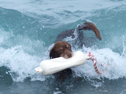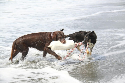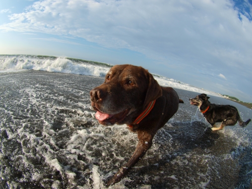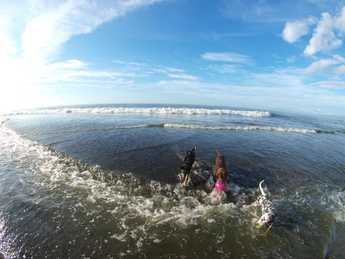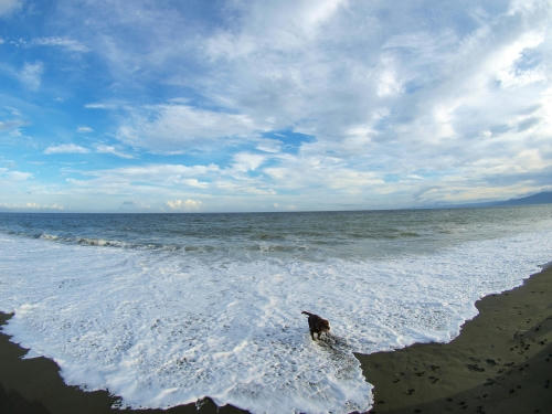 それから別の海に移動して漂着物の清掃状況を視察したら、川の漂着物の山が二つ出来ていた。今回の漂着物は多量で清掃にも時間がかかりそうだなんて思ってたら、かなり暑くなってきたのと漂着物の中にボールを発見したのとで予定外に海に入ってしまった。海はまた地形が変わっていて少し波があっても遊べそうな感じだったしね。そうやって遊んでいるとクロエちゃんが向こうから駆けてきた。