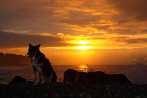 あさ早く起きたんだけど雨が降っていたのでぱぱは海にいつ行くかについて悩んでたみたい。でも、日が昇る時間になって東の空が赤く色づいたのを見たらまだ雨は降っていたけど海に行くのを決心したみたい。
