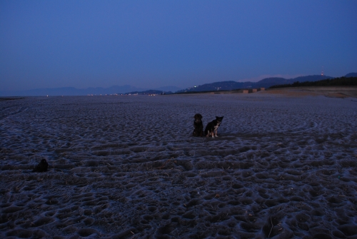 川の岸辺の砂はカチカチに凍ってて貝殻とか石とか踏みつけても蹴ってもビックッともしない。ボクとウサはまだ凍っていないのでぱぱに待てって言われてもふらふらブラブラできる余裕がある。ぶらぶらするのに凍っている砂とフリーの砂とどちらが気持ち良いかを考えるよりも自分の吐く息が白いのの量を見る方が楽しい。ウサは時々カラスさんを蹴散らして遠くまで走って行って帰ってくる。そう、今日は釣り人も誰もいないんだ、寒すぎてこんなとこには来たくなかったんだろうねえ。
