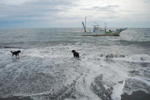 昨日と同じくらい風が強いけど、昨日のうちに表面の砂は飛ばされちゃったみたいで、砂はあまり飛んでこない。でも海の表面はすぐに更新されるので今日もいっぱい塩水が飛んできちゃう。