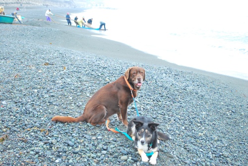 今日の地引網は大漁みたいで浜に網を引き上げるのが大変みたい。