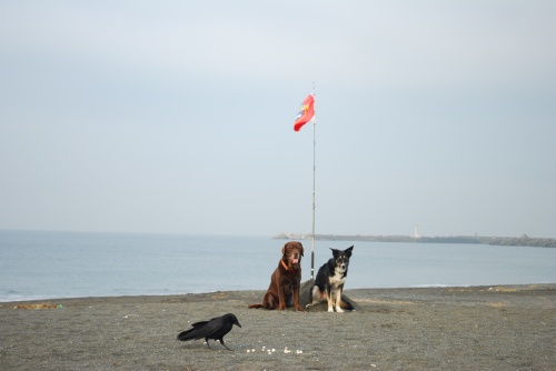 波打ち際を歩いてると、この前のカラスさんが友達を連れてやってきた。
