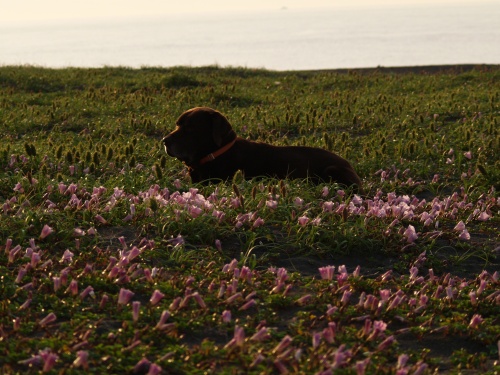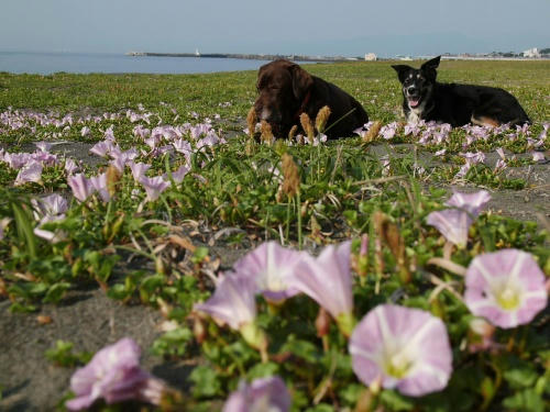 ボクタチが花の中で寝そべってると知らないおじさんがやってきて「このワンコ達っておとなしいんだ?」といった。ぱぱは暫く間をおいて「そうですね」って返事をした。ボクはぱぱの知り合いかと思って立ち上がったら、ぱぱが「座れ!」と言った。ボクはすぐに「伏せた」。するとその知らないおじさんは「ちゃんと言われた指示に従うんだ!」と言った。