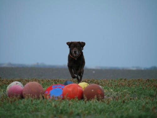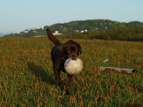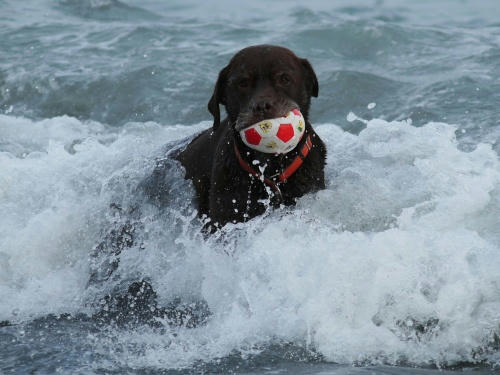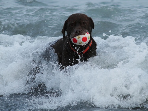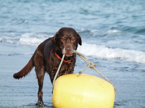 このボールは水の中で使うのには適してないんだけど、いろんな都合があって使われることになったんだ。適してない理由は、中に水が入っちゃうから咥えたときに塩水を飲んじゃうことになるからなんだよね。