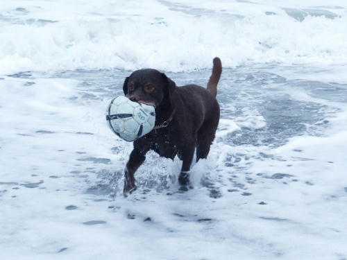 ボール遊びなんだけど、昨日使おうとしたボールとは違うんだ。昨日のを海に着いて探したんだけど見つからなかったんだ。で、海であそんでお家に帰って車が定位置に付いたらパーーンって音がして昨日使おうとしたボールはボールじゃなくなったみたい。車の中で3回くらい咥えた事があるけどちょうど良い感じの大きさだった。