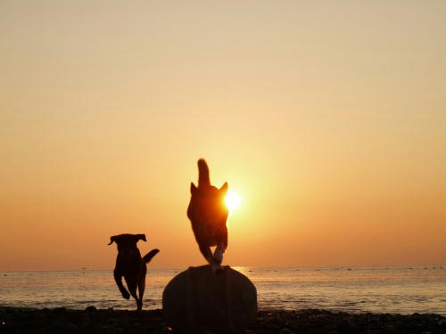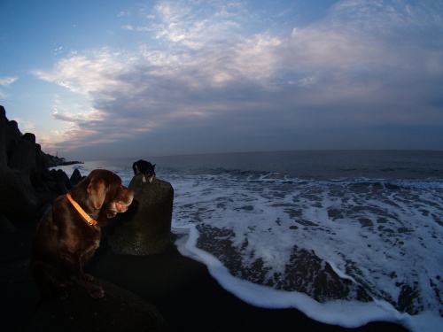 海に到着したのはまだかなり薄暗い時間だった。ボクタチガ波打ち際を歩いていると突然目の前を何かが走り出した。ネコさんだ!波打ち際にネコさんがいるなんてボクが生まれてから始めての出来事だ。この前アジの会場で観戦していたネコさんと同じくらい貴重かもしれない。明日からは波打ち際でもネコさんを探すウサを見ることが出来るかも知れないけど、それは全然貴重ではないことは言うまでも無いよね。