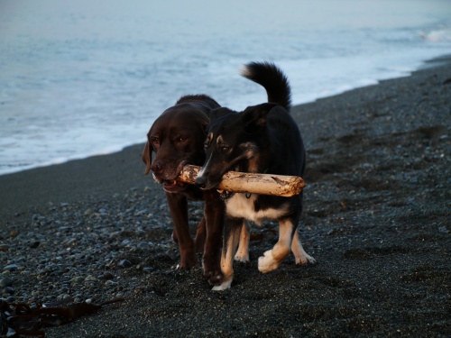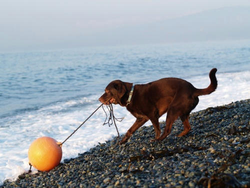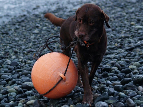 これはボクが作ったおもちゃ。ぱぱが長いロープを見つけてきたんだけどそのロープを適当な長さに切る道具が無いのでボクがぱぱの指示通りの長さに切りそろえたんだ。歯も磨けるからいっせきにちょうだね?でこれは咥える位置で遊び方も変わるんだよね、真ん中で咥えれば簡単に持ち上げて運べるけど端っこだとイッショウケンメイ引っ張らないといけない。ボクの好みは端っこなんだよね。