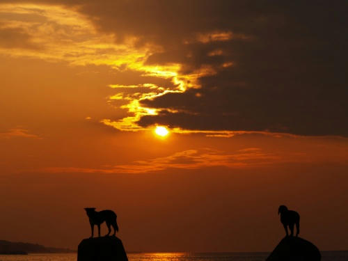朝早くっていうか、夜中に起こされてここに来た。ここの近くには川が流れているんだけど降りることは出来ないんだ。でもって緑のすごいクルマにアタマに草をはやした人が乗って走ってるので少しだけへんだね。ウチに帰る途中で海によったんだけど、少ししたら赤いおつきさまが出てきただけで釣り人も多くていまいちだったかな。