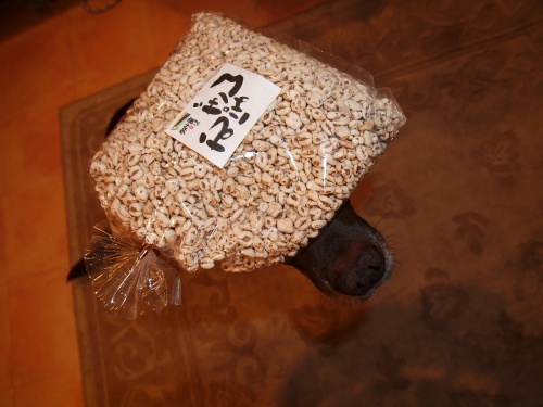 ぱぱが帰ってきた。お土産にレタスとこれを持ってきた。お土産なのでアタマにのせなきゃいけないみたいだけど、夜なのに朝食みたいにミルクをかけて食器に入れて食べると美味だった。でもこれってハトとかのゴハンと同じもののような気がする。コイとかもきっと好きだよね。