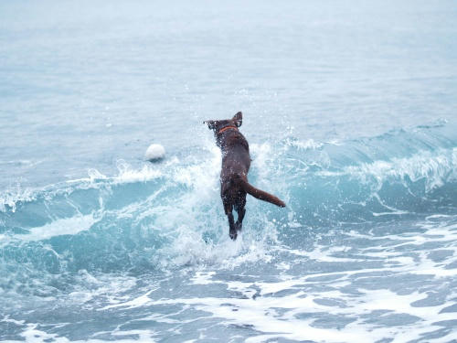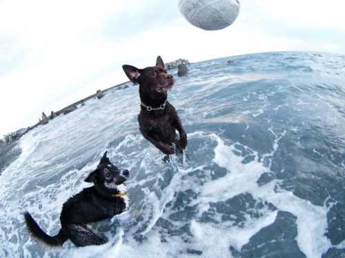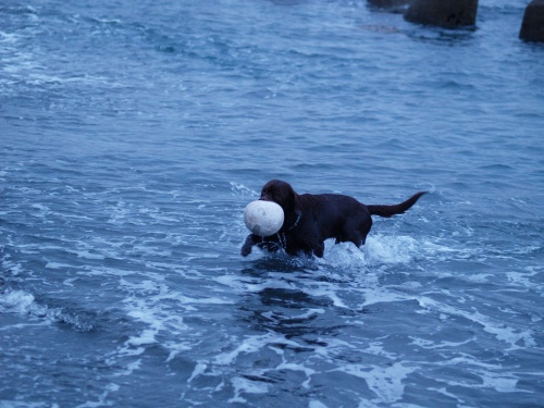 きのうおうちに帰って車から降りたら、ボクのバレーボールが置いてあった。だからボクはこれを明日は持って行って遊ぶよってボールを咥えてアピールしたんだ。だからきょうは雨だけどちゃんとボール遊びが出来たんだよ。ちょっと寒いんだけどね。ちなみに遊び疲れた頃にぱぱがボールを遠くに投げたのでこのバレーのボールは沖に流れて行っちゃったんだね。