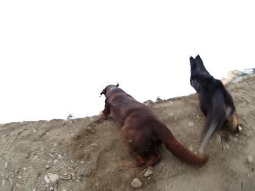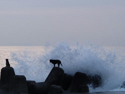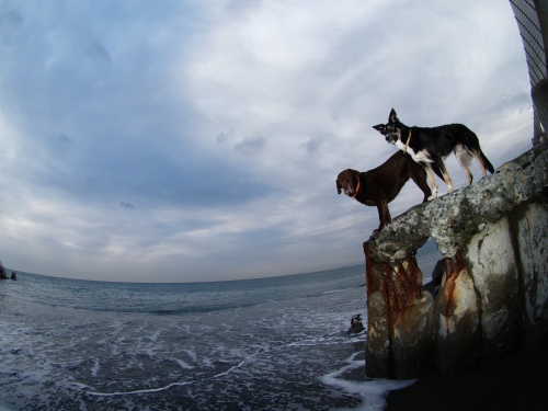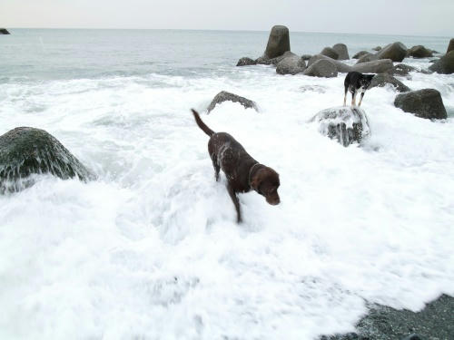 きょうも風が強いんだけどまた波を避けながらここまで来た。こっちに来るわけは、こっちだけが砂浜だからで、ウサは嬉しくて走り回ってボクにアタックして来るから少しメイワク。このちょっと高いところでおやつを少し食べてからまた引き返すんだよね。