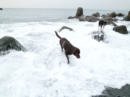 あまり波は高くないからいつものとこを通って別の海にブロックを入れてるほうに向かった。ボクもウサもぜんぜんぬれないで目的を達したんだけど、ぱぱが遅いので迎えに行ったウサは少しだけぬれちゃった。さいきんはぬれちゃっても別に問題ないんだけど、ぬれちゃう前はなんとなく波を避けちゃうんだよね。