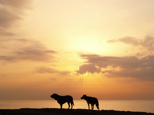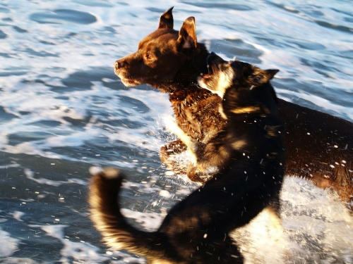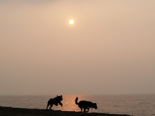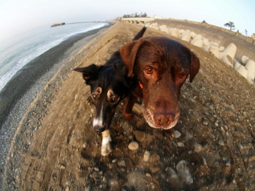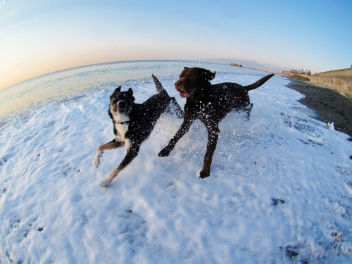 ボクたちも付き合って波打ちぎわでじゃれあってたら水浸しになっちゃった。ちなみにウチの前のバケツには氷がはってたんだけどね。