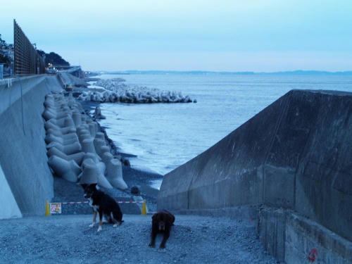 昨日よりは暖かいね?だから海には棒をもったおまわりさんがいっぱいいた。ぱぱはがんばっておまわりさんがいなくなるまで散歩をしようと思った見たいなんだけど、けっきょくはダメで、ビニール袋を車の後ろのワイパーにぶら下げるのはあきらめたみたい。