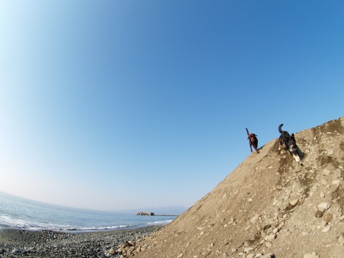 いつものように海にやってきたら今日は波があんましなくて少し狭い場所を通り越してこれた。いつの間にか坂道が出来てたりするから驚いてしまう。遠くのほうにもいろいろあるみたいだけど、ボクンチの前はマダマダダメなのかな?
