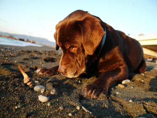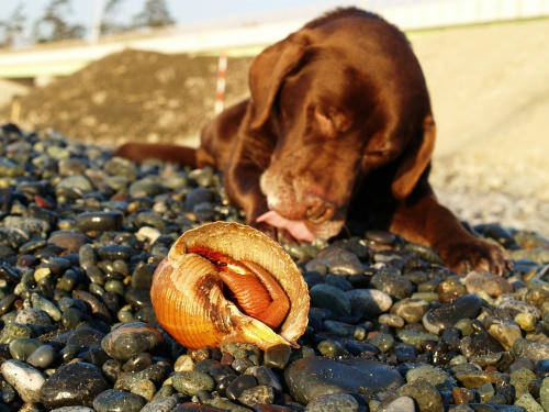 2日間海に行かないうちにまた浜は狭くなっていた。でも今日は波が引いていたので、ぱぱの先導で難所を越えて道路へあがれるとこまで行ってみた。そしたらこの前まで置いてあった網入りの石がなくなってたんだ。どこに持って行っちゃったんだろう。不思議だ。
