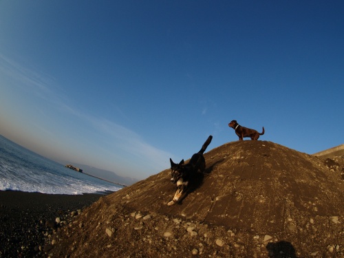もうずいぶん海は埋められたんだけどこの場所の方向じゃなくて、波の方向だから暫くはこのブロックで遊んでられるみたい。このブロックで遊んだ後は埋め立てているとこの傾斜を昇ったりして遊んでるんだけど、足とか汚れちゃうのが難点だね。