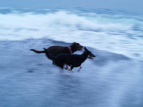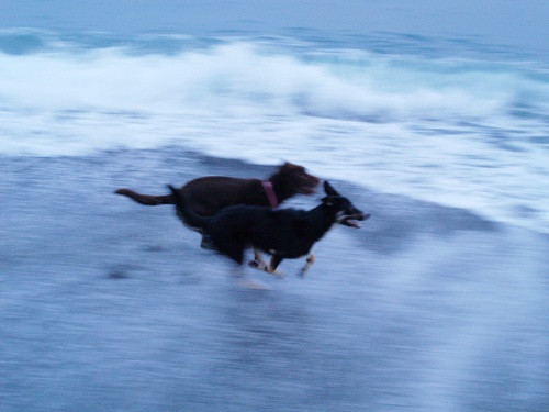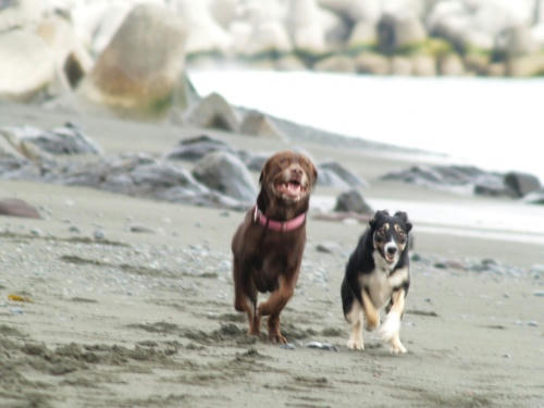 きょうはお肉の日なんだけど冷蔵庫に入ってなかったみたい。だから変わりに久しぶりの波打ち際のかけっこだ。さいきんこれをやらないのは終わった後にクッションが濡れちゃうからなんだけど、今日はクッションなしで車に乗ったからそれは大丈夫だった。その代わりぱぱはペットボトルの水で自分の靴を洗ってたみたい。