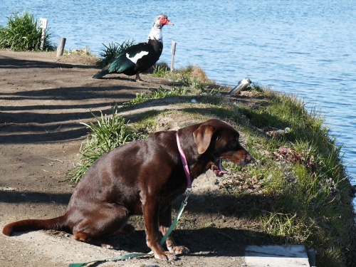 朝は海に行ったし、昼は川に行ったし、おやつもそれなりにもらったし、案外良かったのかもしれない。川で見知らぬ鳥さんと記念撮影したんだけど、ウサは恐がって逃亡したのでボクだけだ。この鳥さんは泳がないで日向ぼっこしていた。