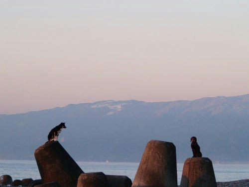 きょうも同じ方向に歩いていく、途中にウサの爪くらいの魚がいっぱい落ちてるからそれをボクが食べないように気をつけながら歩いていく。なみのせいでそれ以上いけなくなると、引き返して砂の上をまた歩く。ウサはそれが楽しいらしい。ボクは時々岩とかに乗っておやつがもらえるのか試してみる。ちょっと高い岩に乗ると降りるのにぱぱの補助が付くのがさいきんの散歩だ。