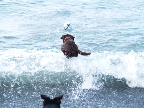 サッカーボール持参で朝のお散歩。あまり空気の入ってないボールなのでぱぱが一生懸命蹴っても波を越えて飛んで行かない。水しぶきがあがってぱぱが水浸しになったり、ボールがウサにあったって跳ね返ったりでぜんぜん遊べなかったんだけど、ボクが疲れた頃になってやっとサッカーボールは手で投げてもぜんぜん問題ないって事に気が付いたみたい。そんなの最初に気が付いてもう少し有意義に遊ばして欲しいよね。