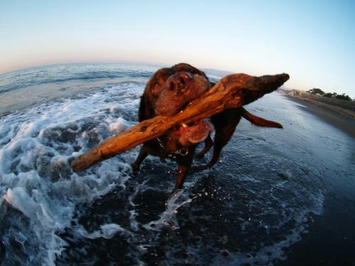 きょうは少し早く出かけられたけど波が少し高かった。でもなんだかウサは元気で波を跳び越えてこの棒を取りに行った。でもお約束で波に巻き込まれちゃったけど、それでも棒をくわえたまま浜に上がってきた。さいきんめきめきとうでを上げてきてるんだよな。まあ小さな棒のときだけでボールならボクの勝ちだとおもうけどね。
