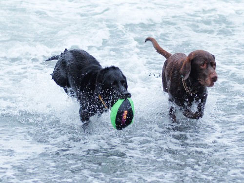 朝の散歩が短いとおもったら、まもなくチェリーちゃんとコルルちゃんが遊びにきた。朝は波が低いとおもってたのに一緒に行ったら凄く波が高かった。お客さんの場合はオモチャも新品なんだけど、いまいち好きじゃ無かったみたい。午後からはまた車に乗って出かけたけど、涼しい場所だったね。