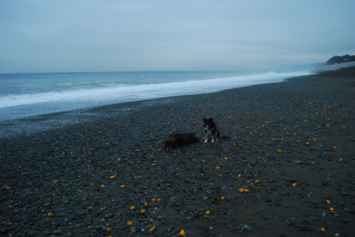 ここの海は実験場になっちゃったみたいだ。ぱぱの話によれば来年のウサの誕生日くらいまで実験が続くみたいだ。この黄色いのはペンキのついた石なんだけど、ぱぱは最初これが黄色いピーマンだと思ったみたいだけど、ピーマンじゃ実験できないよね。