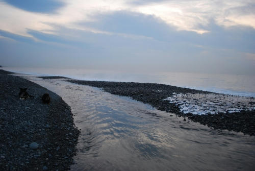 この川に来るまでには砂利の海を一生懸命歩かなきゃいけない。途中砂のところがあるとそこだけすきっぷらららをしながら歩ける。今はそれに流木の丘が点在しているのでそこでは少しだけにおいを嗅ぐことができる。あ、あとその流木を燃やした灰の池があるんだけどそこに入るとぱぱに怒られるので入らないように注意が必要だ。