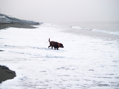 ボクタチは波打ち際をふらふらと歩いていたんだけど、ぱぱは未だ拾い残されているイワシを拾い始めた。当然ボクタチはフセヲして待たされてた。ぱぱがしばらく歩いてると地引網のおじさんがぱぱを手招きしてた。
