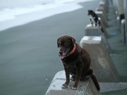 朝になると雨も小降りになったので、ボクはすやすや寝てたのにぱぱに何となく起こされて、何となく海に出かけた。きょうはあまり波も高くなかったので雨でも波打ち際は歩きやすかった。