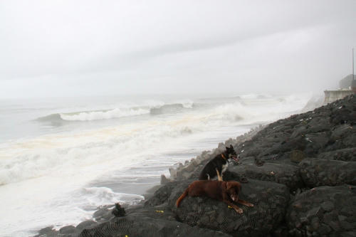 早く起きて天気予報を見たぱぱは早く出かけなければ強く雨が降ると判断したみたい。結局いつも通り出かけてもあまり変わらなかったってことはあとでわかったんだけど、通行止めの道路の向こう側を見学した。