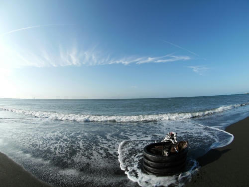 海には昨日のトンネルがまだ残っていたので何か良い遊びは無いかな?ってぱぱは考えたみたい。でも何もすることが無いので中に入って遊ぶだけだった。トンネルを使って歩きながら遊べるアイデア募集中だけど、この中に入って遊ぶのも、ウサとボクと後だれか二人くらい入るともう少し面白いのかもしれない。