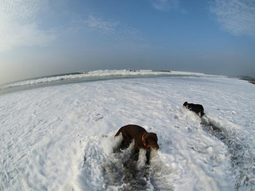 今日も波が高い。ウサは走り回って暑くなると波打ち際に横たわって波をかぶって涼んでる。ボクはそんな趣味はないのでぱぱにおやつをもらうために波打ち際に居るだけで、あんまり波には触れていないのでちょっと暑い。今日の遊びと言えばボールキャッチなんだけど、ボクんちのボールは何故か出てこなかったので、クロエチャンのゾウさんのボールを時々借りてピービー鳴らしてた。夕方の海にも行ったけど、蒸し暑くて長居は出来なかった。