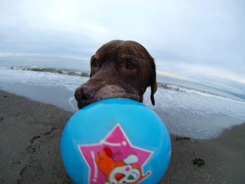予想通り涼しいいちにちだった。ただ涼しければ元気に遊べるかっていうと、そうでもなくて昨日の大雨で濁ってしまった海の波打ち際をぶらぶらと歩きながら、時々ボールを運んだだけで早めに海からは帰った。
