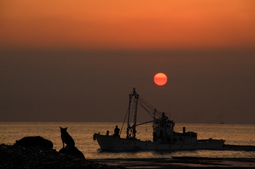 暖かかったり、寒かったりでなかなか熟睡できない。夜の真ん中で起きて水をぴちゃぴちゃのんでると残り少なくなったのでぱぱが追加してくれた。それからしばらくするとウサに起こされることもなく起き上って海に出かけた。海に着いた時には相変わらず暗くて、少し遠いところで、漁師のおじさんが火を燃してるのが見える。ウサはネコさんがうろうろしているのを警戒して姿勢が低い。ボクはそんなことすべてが煩わしくて歩みを止める。