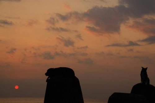 お家を出る時にはまだお月さまが空の真ん中にいたんだけど、曇っていたのでどんな月なのかはわからなかった。海に着くと真ん丸からすこしだけ痩せたお月さまがはっきりとみえた。ただ、まだ少し暗かったので、波打ち際を歩いてもぱぱは楽しそうじゃなかったし、ボクとしてもじゃりじゃりの波打ち際はいまいち好みではなかった。ウサもボクも昨日の疲れが残ってたんだけど、ウサだけはまた走り回ってまた疲れてた。