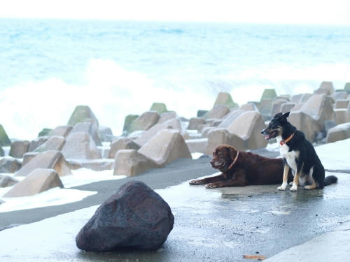 外が騒がしくて朝早く起きたけど、当然雨降りの中強引に海に行こうとは思わなかった。しばらくぱぱは思案していたけど、雨雲のようすとかをいろいろ検討した結果遅くなるほど海には行けないと判断して早めに海に出かけた。海は当然波が高かったけど、カラスさんとかもいつも通りやって来ていたのでそれほど静かな海というわけでもなかった。