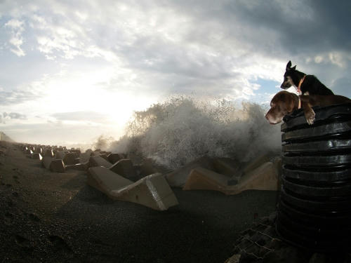 夕方の海も相変わらず波が高くていまいちで、あさとおなじように次のトンネルまで進んだ。そこに大きなロープが落ちてたのでぱぱはそれで遊んで、ボクタチはそこでくつろいでた。
