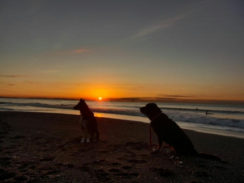 いつものようにお仕事をしてると、向こうから誰かがやって来た。ボクもウサもクロエちゃんかなと思って少しうきうきしてたら、時々会う朝日の写真を撮りに来るペアの人たちだった。女の人の方が、「この子たちちゃんとポーズをとってくれるんだね、えらいね」って言った。今まで会った時は走ったり歩いたりしてるっていうお仕事だったので気づかなかったんだね。