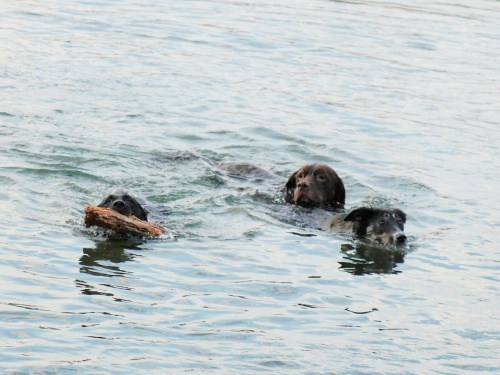 チェリーちゃんが持ってる流木を一番最初にゲットしたのはボク。それをボクから譲り受けたのはウサ。ウサから譲り受けたのはチェリーちゃん。オモチャ連鎖って言うのか下克上って言うのかは良くわからないんだけど、まあそんな力関係なわけだよね。ウサもチェリーちゃんもこの川に入ることに関してはかなり慎重だった事も付け加えておきたいね。