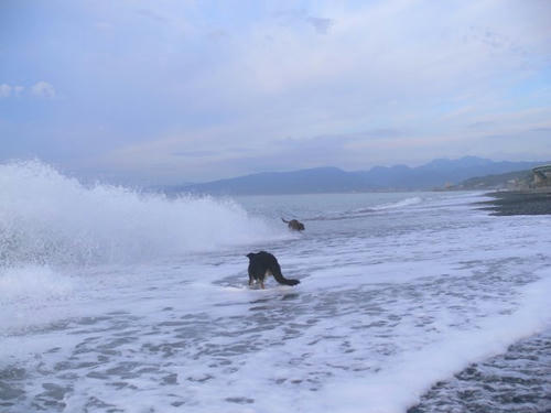波が高いけど石投げ遊びをしてたらおやつのおねーさんがやってきた。ボクタチは忙しかったので、おねーさんは近くのブロックにおやつを置いて去って行っちゃった。遊びを終えたボクタチはそのおやつを美味しくいただいたんだよね。