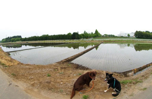 きのうあまり遊べなかったので、ぱぱに苦情を言ったら、ここに連れてこられた。途中の公園でシーソーとかスベリ台とかをたしなんだりしてたどり着いたんだけど、田植えってやつの真っ最中みたいでおじさんたちが朝早くから頑張ってる。そいで、カエルがたくさんその人たちを応援してるみたいな感じで鳴いているいるんだけど、キタロウって子の下駄の音みたいにカランコロン、ガランコロン、ゴロゴロ、ズッ、て聞こえちゃうんだよね。あ、赤いハードルのおねーさんにはちゃんと会えたよ。