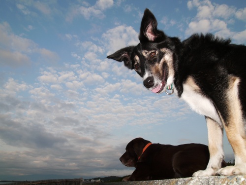 海から帰る前に、防波堤で休憩してから通路を横切ろうと思ってたらむこうからワンコがやってきた、元気なワンコで、ぴょんぴょん跳ねてる。